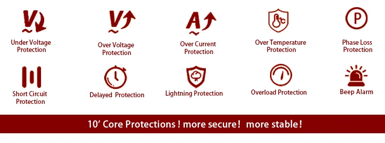 Normal functionsMalti-protect fuction,over voltage/under voltage protection,over current protection,over load protection,saty start protection,manual bypass protection,short circuit protection,lack of phase protection,wrong sequence  protection,indicate alarm,over temperature protection.